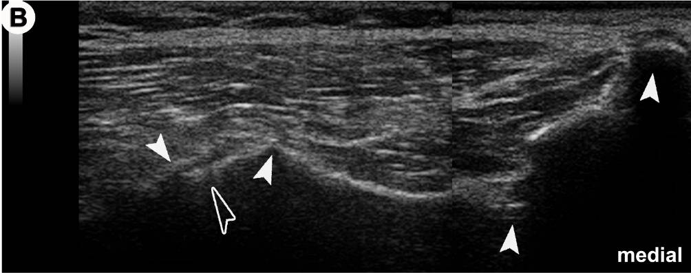In der US-Darstellung ist der dorsalste Anteil des ISG einsehbar (offener Pfeilkopf). Der Spalt entspricht dem radiologischen Gelenkspalt! Die knöchernen Landmarken (gefüllte Pfeilköpfe) sind aber in allen Details deutlich zu erkennen (von medial nach lateral): Crista sacralis mediana, II, Crista sacralis lateralis, Facies glutea ossis ilii.