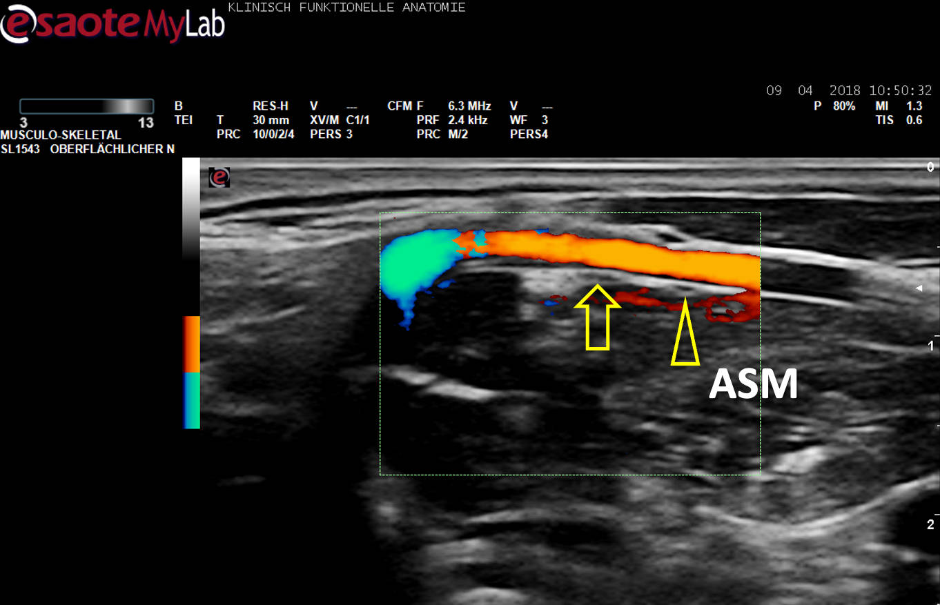 US-Darstellung eines N. phrenicus accessorius (Pfeilkopf) aus C5 auf dem M. scalenus anterior (ASM), ein Gefäß (Farbe) unterkreuzend. Pfeil: N. phrenicus aus C4.