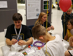 Our two master students, Jakob and Marie build little ion traps with two spoons and a metal wire with visitors at the ‘Lange Nacht der Forschung’.