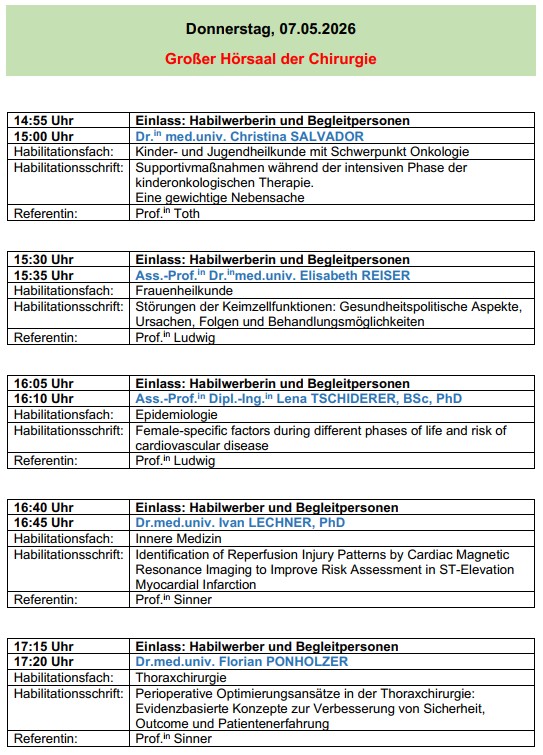 Das nächtste Habilitationskolloquium findet am 07.05.2026 im großen Hörsaal der Chirurgie statt.