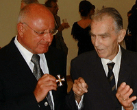 Im Jahre 2003 wurde H. Glossmann das Österreichische Ehrenkreuz für Wissenschaft und Kunst 1. Klasse verliehen. „Er hat wissenschaftliche Pionierarbeit auf dem Forschungsgebiet der spannungs-abhängigen Calciumkanäle der Plasmamembran geleistet […] Auch das Smith-Lemli-Opitz-Syndrom wurde in seiner Arbeitsgruppe erstmalig molekular durch Klonierung des Gens aufgeklärt. Auf Initiative dieses so verdienstvollen Forschers und Hochschullehrers […] wurde außerdem ein gemeinsames internationales Doktorat zwischen den Uni-versitäten Padua und Innsbruck errichtet. Dabei handelt es sich um das erste Programm in Österreich, das auf Grundlage der EU-Konferenz von Prag im Mai 2001 einen wichtigen Schritt zur Verwirklichung des Europäischen Hochschulraumes setzt“(Aus der offiziellen Pressemitteilung) Bild links: H. Glossmann freut sich mit seinem Vorgänger em. o.Univ.-Prof. Heribert Konzett (+2004) – ebenfalls Ehrenkreuzträger – über die hohe Auszeichnung. |