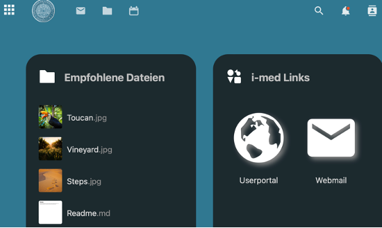 • Mit Klick auf das „Brief-Symbol“ gelangen Sie zur Nextcloud-Mail, welche Sie bei Interesse mit Ihrem Webmail Account synchronisieren können. Wir empfehlen, das reguläre Webmail i-med.ac.at weiterhin zu verwenden.