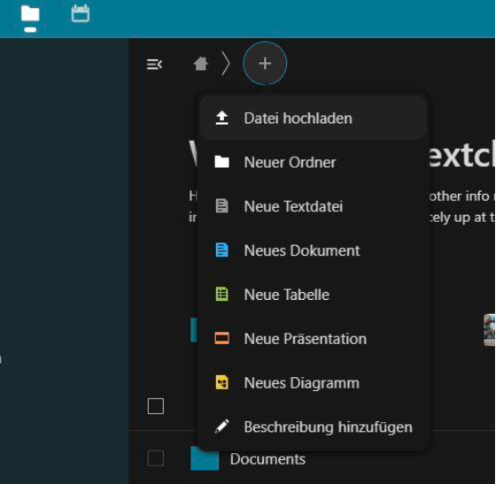 Navigieren Sie zum Ordnersymbol, um die Übersicht Ihrer Ordner und Dokumente zu öffnen. Klicken Sie auf das Pluszeichen, um Dateien hochzuladen. Auch das Ziehen und Ablegen von Dateien in das Nextcloud-Fenster („Drag & Drop“), wird unterstützt.