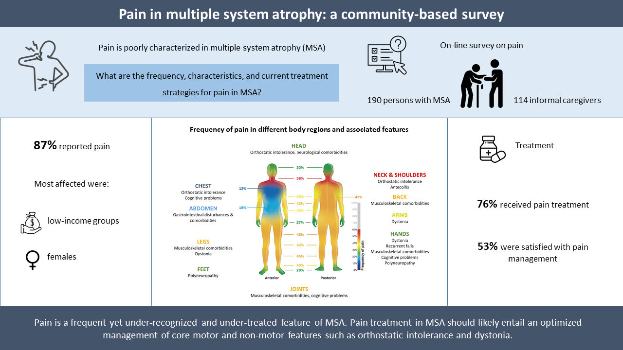 In this community-based study, we learned that 87% of people with MSA suffer from pain, but many of them are left alone to deal with it. Importantly, in certain body regions, pain is associated with treatable conditions such as orthostatic hypotension or dystonia, highlighting important areas of intervention for pain relief.