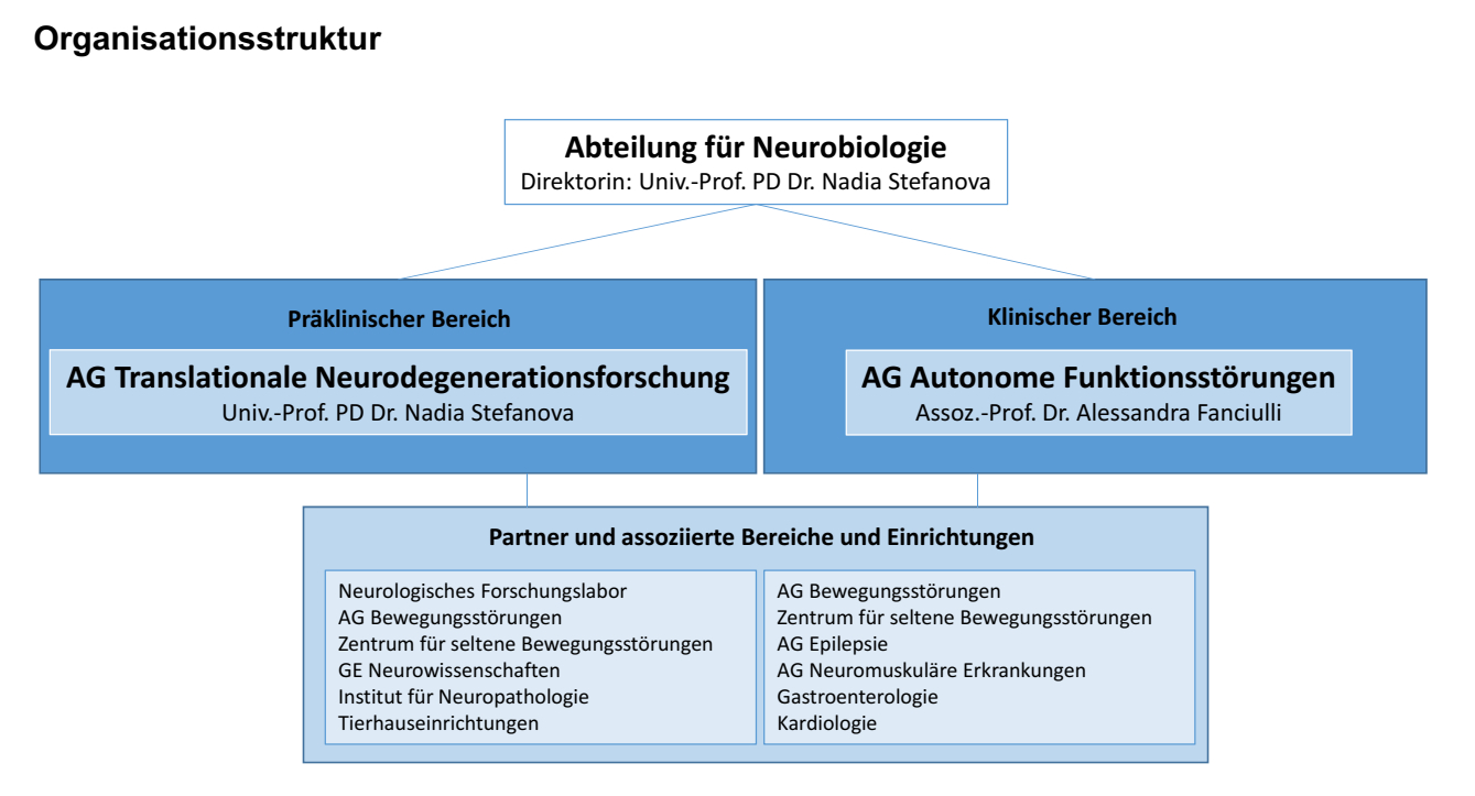 The Division of Neurobiology (Director: Univ.-Prof. Nadia Stefanova MD, PhD) has two main pillars of expertise: preclinical and clinical. The preclinical research program at the Translational Neurodegeneration Research Laboratory (TReND Lab) focuses on understanding the causes and disease mechanisms, on preclinical target discovery and disease modification in MSA and other alpha-synucleinopathies. The clinical research program at the Dysautonomia Center focuses on the early identification and development of personalized care programs for individuals living with MSA and other disorders of the autonomic nervous system.