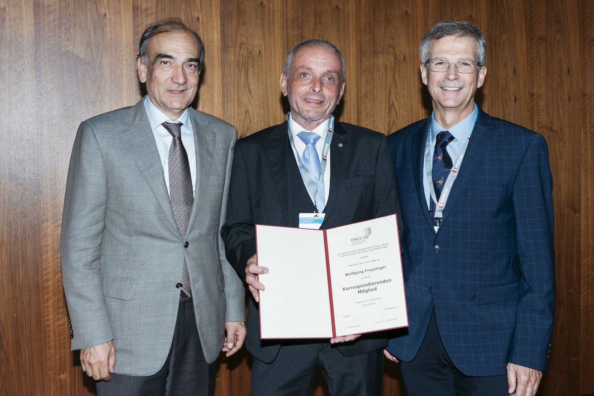 Einig war sich der Vorstand der HNO Gesellschaft Österreich, als sie Wolfgang Freysinger von der Innsbrucker Universitätsklinik für HNO, der sich vor allem mit der intraoperativen Visualisierung beschäftigt, in „Anerkennung  seiner Leistungen“ die korrespondierende Mitgliedschaft im Rahmen des Kongresses feierlich verlieh. Wolfgang Freysinger hatte bereits 1994 mit der Einführung computerunterstützter Chirurgie an der Innsbrucker Universitätsklinik für Hals-, Nasen- und Ohrenheilkunde begonnen. Mittlerweile verfügt die Klinik über mehrere klinisch zugelassene Navigationssysteme, die millimetergenaue Anwendungen bei endoskopischen Eingriffen an der vorderen Schädelbasis und mikroskopischen Eingriffen an der seitlichen Schädelbasis erlauben. In der AG 4D Visualisierung arbeiten Freysinger und sein Team an Verfahren zur Qualitätssicherung klinischer Navigation sowie an intuitiven visuellen Darstellungen von zuverlässiger intraoperativer Information für Chirurg:innen. Im klinischen Tätigkeitsfeld an der Univ.-Klinik für HNO arbeitet Freysinger intensiv mit den HNO-Chirurg:innen, insbesondere mit Klinikdirektor Herbert Riechelmann, zusammen.