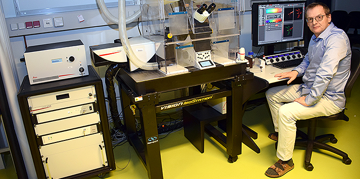 Bilder unten: Das Superresolution gSTED Mikroskop mit Martin Offterdinger (Foto: MUI/Bullock)