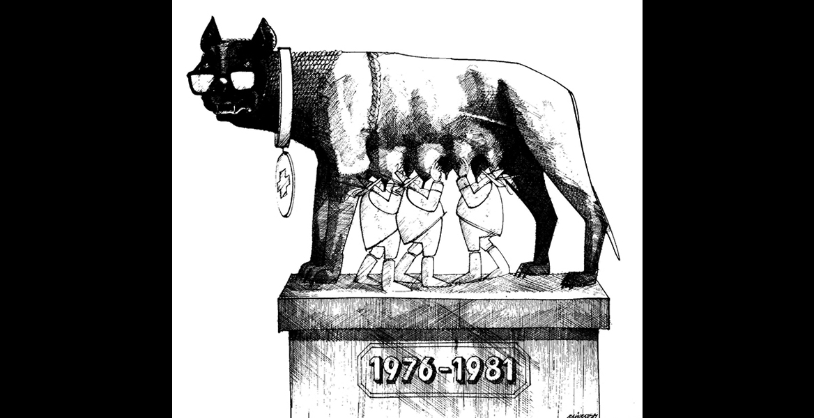 Abbildung 1: Die ungeheure Wirkung von Klaus Wolff als Ernährer und Mentor seines “Wolff-Rudels”. Foto: Dermatologie Innsbruck.