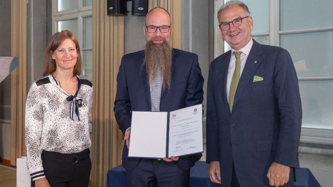 BU: Rachel Guerra (l.) überreichte dem letztjährigen Preisträger Matthias Erlacher (M.) im Beisein von Rektor W. Wolfgang Fleischhacker (r.) die Urkunde.