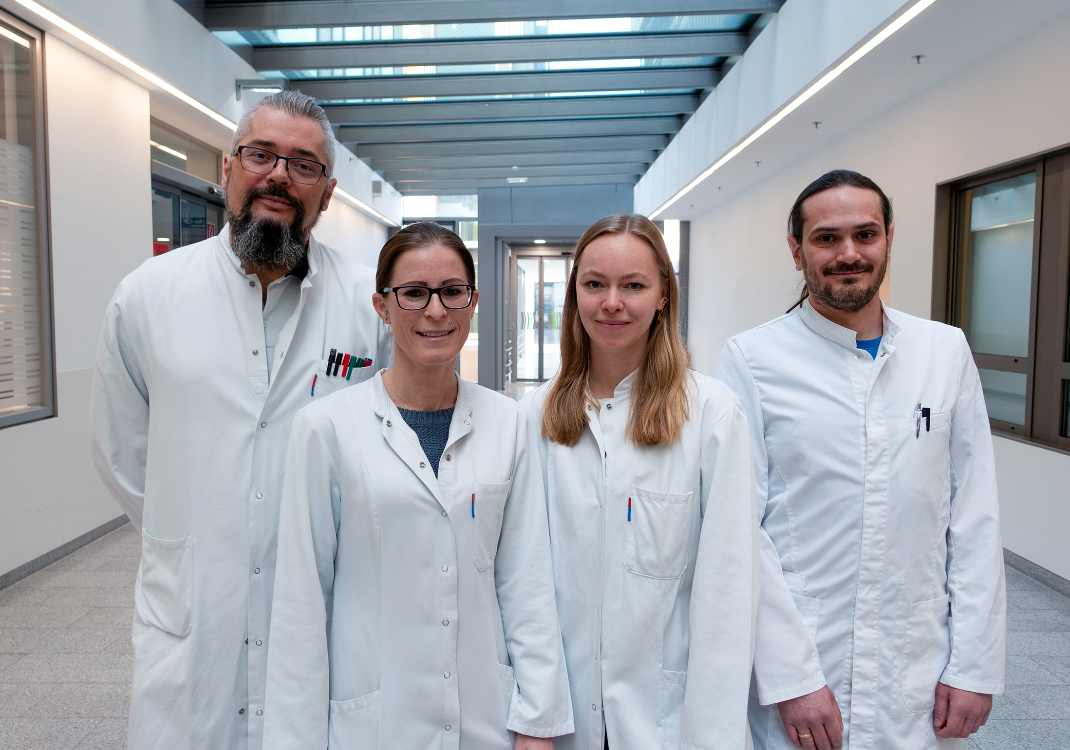 BU: v.l.: Martin Puhr mit Erstautorin Andrea Eigentler, Antonia Degen, die inzwischen ihren PhD bei Judith Hagenbucher im 3D-Bioprinting Labor (Pädiatrie I) begonnen hat und Florian Handle, mittlerweile am Institut für Pathologie, Neuropathologie und Molekularpathologie. (Foto: Robert Schober)