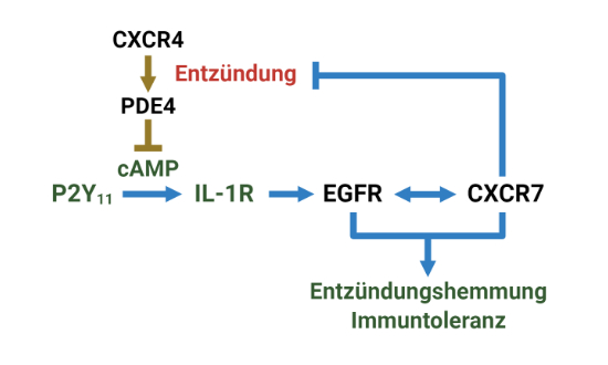 Auch in der aktuellen Forschungsarbeit haben Thurnher und Klaver Transkriptomanalysen bzw. Sekretomanalysen in humanen Makrophagen durchgeführt. „In dieser Analyse haben wir uns 20 Chemokin-Rezeptoren angeschaut, nur zwei davon haben reagiert, nämlich CXCR4 und CXCR7. Diese extreme Selektivität spricht für eine wichtige Rolle und für eine enge Beziehung dieser beiden Rezeptoren“, erklärt Martin Thurnher. Es zeigte sich, dass P2Y11 und IL-1R gemeinsam den EGF-Rezeptor (Epidermal Growth Factor Receptor) aktivieren, was wiederum die CXCR7-Expression hochreguliert. Die Expression von CXCR7 steht dabei in Abhängigkeit von der Menge an zyklischem Adenosinmonophosphat, cAMP, das für seine entzündungshemmende Wirkung bekannt ist. In einem dynamischen Balanceakt, regulieren sich CXCR7 und CXCR4 also wechselseitig, was letztlich darüber entscheidet, ob der anti-inflammatorische oder der entzündliche Weg beschritten wird. „Die Regulation dieser Wechselbeziehung geht dabei vor allem über cAMP. Die anti-inflammatorische Schiene geht über CXCR7, der nicht an G-Proteine koppelt, während CXCR4 pro-inflammatorisch wirkt und die anti-inflammatorische Schiene hemmt. Wird CXCR7 vollständig aktiviert, übernimmt er die Kontrolle und unterdrückt CXCR4“, beschreibt Klaver den immunologischen Prozess.