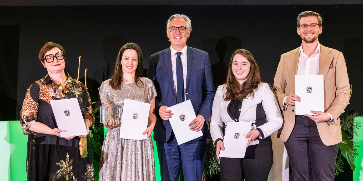 BU: Die Gewinner:innen von der Univ.-Klinik für Gynäkologie und Geburtshilfe, v.l.: Alexandra Ciresa-König, Mara Mantovan, (Generalsekretär Martin Netzer, BMBWF), Adriana Wördehoff und Christoph Walter Ebner. Nicht am Bild: Katharina Knoll. © BMBWF/Sebastian Judtmann