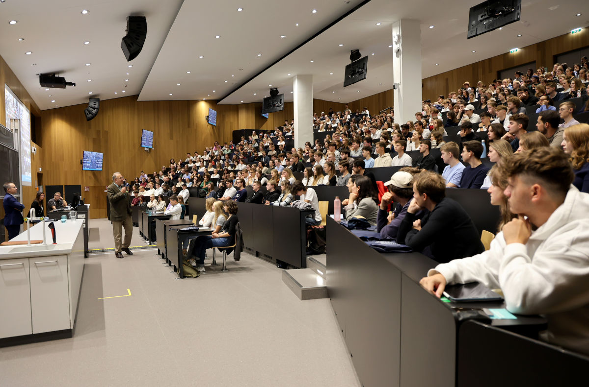 Rektor und Vizerektor heißen die neuen Studierenden im bis auf den letzten Platz besetzten Audimax willkommen