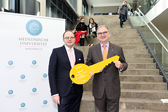 BU: Maximilian Pammer, Leiter des Unternehmensbereichs Universitäten bei der BIG, übergibt symbolisch den Schlüssel an Rektor W. Wolfgang Fleischhacker. (Fotos: MUI/D. Delius)