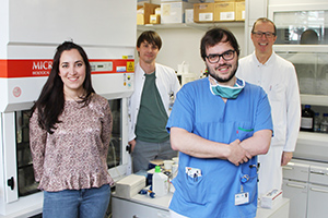 BU: Die Erstautor:innen Lisa Mayr und Felix Grabherr (vorne) mit Timon Adolph und Herbert Tilg (hinten, v.l.)