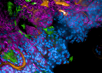 BU: Fluoreszenzmikroskopische Aufnahme eines mit SARS-CoV-2-infizierten Lungengewebes ©Wilflingseder/Posch/Noureen