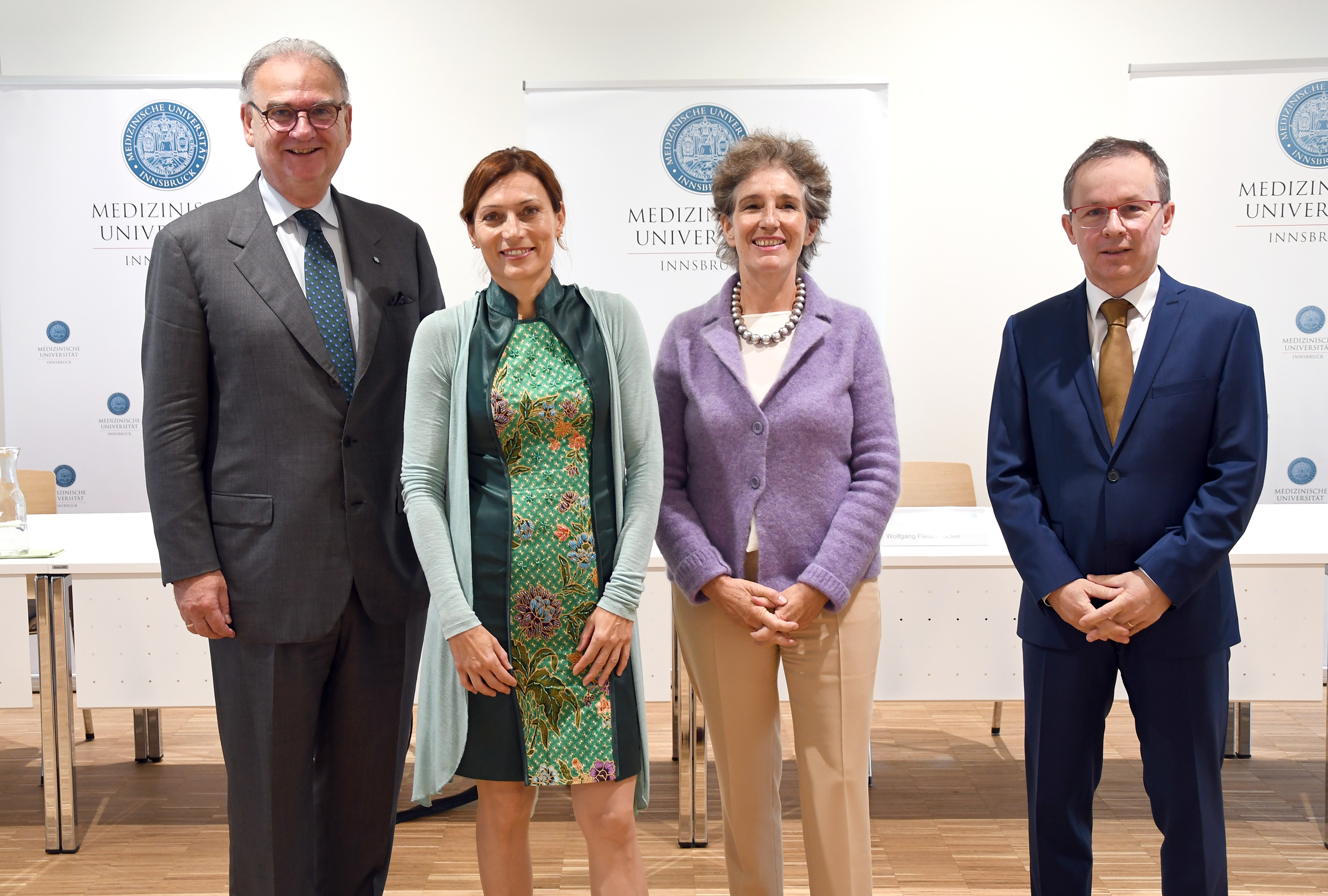 Innsbruck, 05.10.2021: Der von Rektor Wolfgang Fleischhacker und seinem Team eingeschlagene zukunftsorientierte Weg geht in die Verlängerung: Anfang März 2020 hatte der Universitätsrat der Medizinischen Universität Innsbruck nach positivem Votum des Senats für eine weitere Amtszeit von Fleischhacker einstimmig gestimmt. Erstmals tritt damit ein Rektor an der Medizinischen Universität Innsbruck eine zweite Amtszeit an. „Wir betreten aber kein Neuland, denn wir als Rektoratsteam erhalten damit den Auftrag und die Möglichkeit, unseren bisher bewährten Weg fortzusetzen,“ betont Fleischhacker. Im Team gibt es dementsprechend auch nur eine personelle Veränderung: Peter Loidl hat nach acht Jahren im Amt des Vizerektors für Lehre und Studienangelegenheiten den geplanten Ruhestand angetreten. Ihm folgt der Facharzt für Hygiene und Mikrobiologie, Wolfgang Prodinger, nach. Vizerektorin Christine Bandtlow (Forschung und Internationales) und Manuela Groß (Finanzen und IT) setzen ihre Arbeit in ihren bisherigen Ressorts fort.