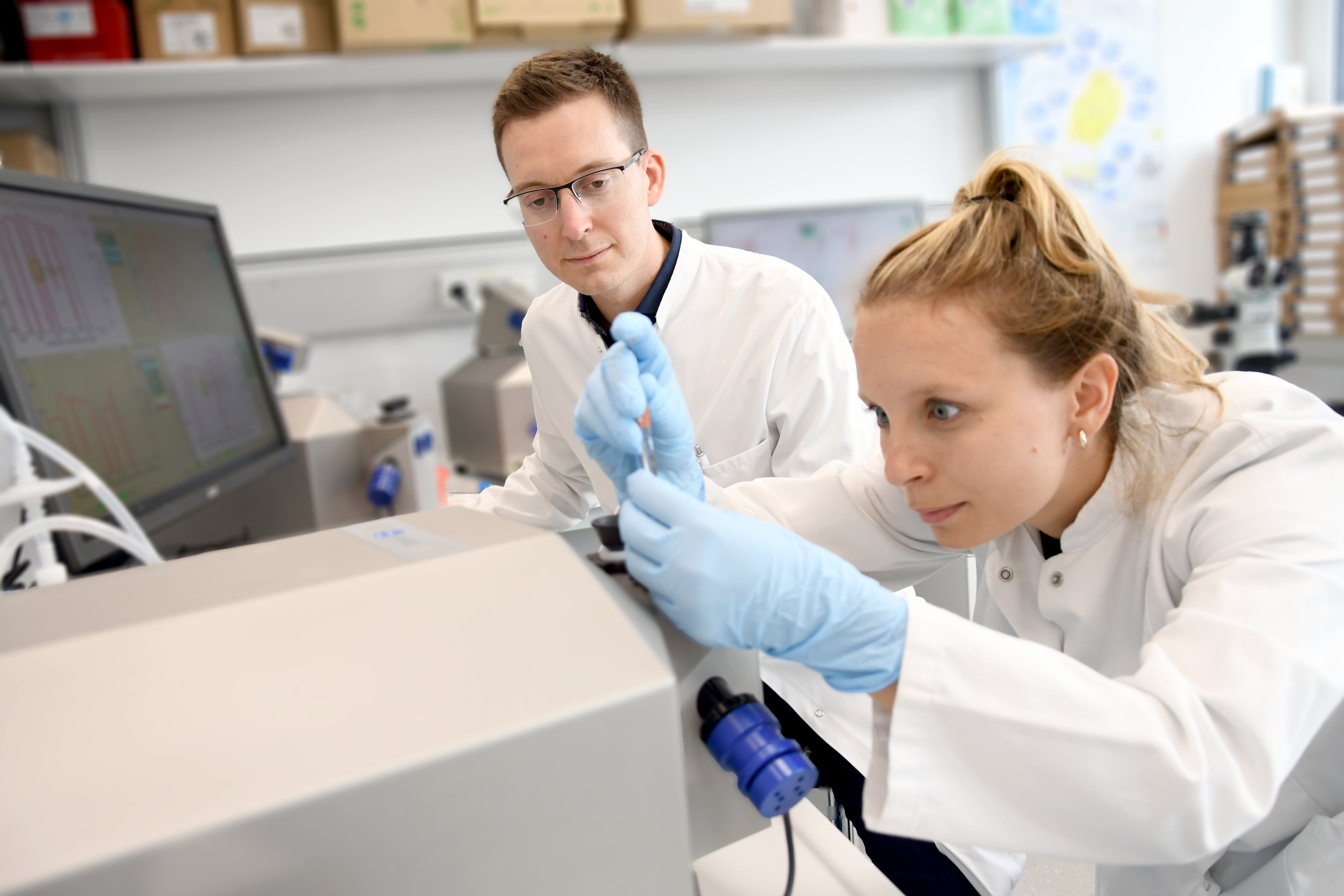 u.l.: Für die Bestimmung der Zellatmung mittels hochauflösender Respirometrie sind nur winzige Gewebeproben erforderlich. Im Bild: Andras Meszaros mit einer Mitarbeiterin im organLife Labor. (c: MUI/D. Bullock)
