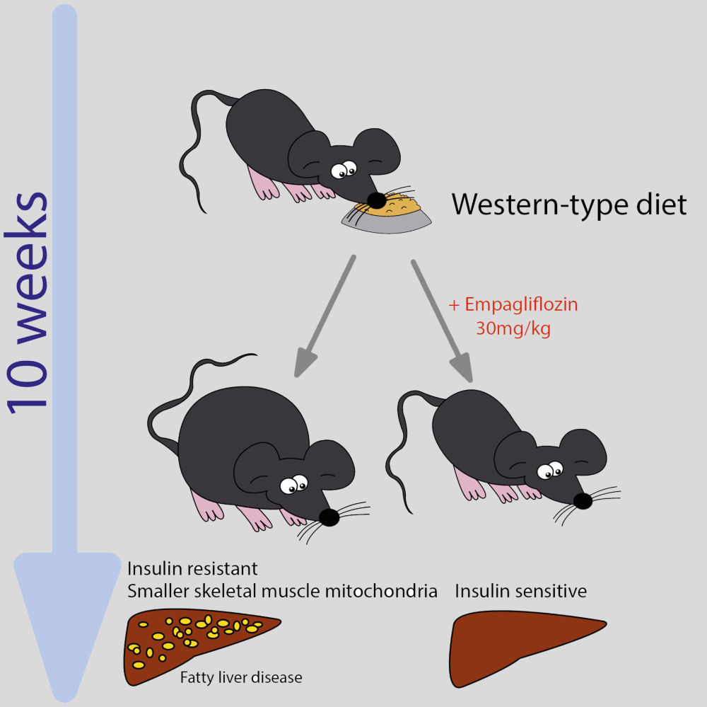 Um zu prüfen, wie Empagliflozin vor Gewichtszunahme und anderen Folgen ungesunder Ernährung schützt, wurde die Wirkung der Substanz an gesunden Mäusen mit einer hochkalorischen fett- und kohlehydratreichen, also typisch westlichen Diät getestet. Unbehandelt führte die Fütterung mit dieser Diät über einen Zeitraum von zehn Wochen zu Insulinresistenz, Übergewicht und Leberverfettung. „Zahlreiche Studien haben bereits die Effizienz von SGLT-2 Inhibitoren bei ernährungsbedingten Stoffwechselerkrankungen gezeigt. Das Besondere an unserer Studie ist, dass erstmalig der Frage nachgegangen wurde, ob die Gabe von Empagliflozin bei an sich gesunden Mäusen Diät bedingte Stoffwechselstörungen verhindern kann“, beschreibt Erstautor Bernhard Radlinger das Studiendesign.