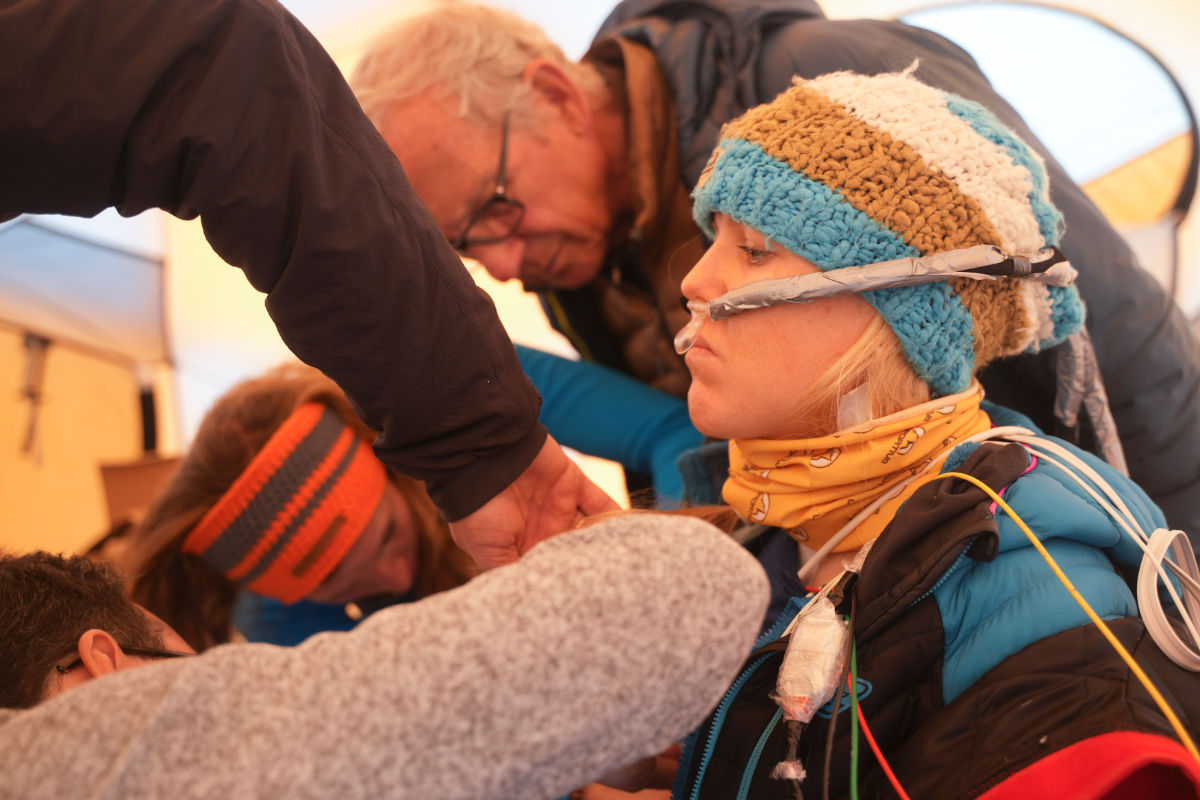 Die Teilnehmerin wird für die Tests unter dem Schnee vorbereitet. (Copyright: Eurac Research/Marina Baldo)