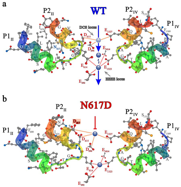 Fig. 1: Ca2+ selectivity and conductance mechanisms in the wt and mutant DHPR (N617D) channel pore. Conformational prediction models depicting the hypothetical mechanism of Ca2+ conductance through the wt DHPR (a) and the block of Ca2+ conductance due to atypical high Ca2+ binding affinity (as a result of introduction of the negative charge D617; boxed in red) in the DHPR(N617D) pore region. Dotted lines indicate binding interactions between Ca2+ ions (blue spheres) and carboxyl oxygens (red balls) of glutamates and aspartates. Low-affinity Ca2+ binding is indicated by light blue spheres and high affinity binding by dark blue spheres. The DCS locus is the divalent cation selectivity filter and the EEEE locus is the Ca2+ selectivity filter. Vertical blue arrows indicate an active Ca2+ conductance pathway in wt DHPR (a), and the red T-bar indicates a block of Ca2+ flux by aberrant high-affinity binding to the DCS locus in the mutant DHPR(N617D) channel pore (b).