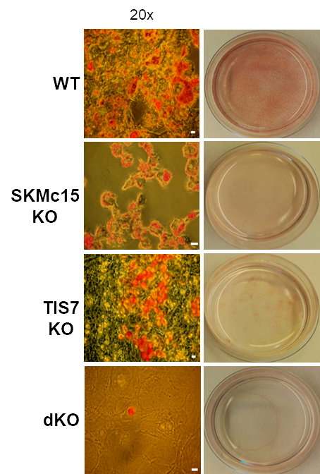 TPA-induced sequence-7 (TIS7) protein has been shown to be involved in the regulation of differentiation processes in various cell types, e.g. neurons, enterocytes, myocytes and recently also adipocytes. Current data show that TIS7 is upregulated in white adipose tissues of genetically obese ob/ob mice. In previous studies, we have identified that TIS7 protein functions as a transcriptional co-regulator, owing to its interaction with protein complexes that contain either histone deacetylases or protein methyl transferases (Lammirato et al., BMC Biol, 2016). Analyses of adipocyte differentiation suggested an involvement of TIS7 in the regulation of adipogenesis in the Wnt/β-catenin signalling context. Based on experiments with TIS7 knockout mice generated in our laboratory, we identified a negative effect of TIS7 on Wnt signalling and a positive effect on adipocyte differentiation. Compared with wild-type littermates, TIS7 knockout mice do not gain weight when chronically fed with a high-fat diet. SKMc15, a second member of TIS7 gene family, is highly conserved in different species. However, there has been no information to date concerning the physiological function and mechanisms of action of SKMc15 and its possible involvement in the differentiation of various tissues. We have therefore generated mice that lack either SKMc15 or both TIS7 and SKMc15 genes and we are currently analysing the effects of both TIS7 and SKMc15 on the regulation of adipogenesis. The ablation of both TIS7 and SKMc15 genes significantly affected the expression of genes that are essential for adipocyte differentiation and function. Since dKO mice render a substantially leaner phenotype, we propose that TIS7 and SKMc15 represent novel players in the process of physiological adipocyte differentiation.Differentiated cells can re-enter the cell cycle to repair tissue damage, via a series of discrete morphological and molecular stages. Using TIS7 knockout mice generated in our laboratory as a specific experimental animal model, the group with which we are involved, led by Prof. Jason C Mills from Washington University School of Medicine in St Louis, USA, identified TIS7 as a part of this conserved cellular regeneration programme called “paligenosis”.We were recently involved in the development of a novel assay in Taras Valovka’s laboratory, to detect and characterise interactions between transcription factor NF-κB and dsDNA. This technique can be expanded to detect and characterise sequence-dependent protein-dsDNA interactions as well as other transcriptional factors.Together with the Ezzatollah Fathi’s laboratory at the University of Tabriz, Iran, we studied various cellular mechanisms involved in tissue regeneration, with a possible application for experimental cell therapies. This project resulted in a number of joint publications in 2020.