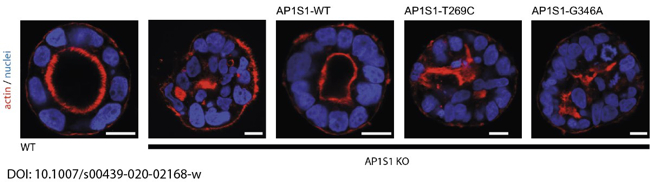In a close collaboration with Andreas Janecke and Thomas Müller from Paediatrics I, we recently identified two novel missense mutations in the adaptor protein AP1S1, in patients diagnosed with congenital enteropathy. Defects in AP1S1 are associated with MEDNIK syndrome. In AP1S1 knockout CaCo2 cells, we observed altered localisation of tight-junction proteins ZO-1 and claudin 3, reduced transepithelial electrical resistance and increased dextran permeability of the CaCo2-AP1S1-KO monolayer. In addition, lumen formation in 3D cultures of these cells was abnormal. Re-expression of wild-type AP1S1 in CaCo2-AP1S1-KO cells reversed these abnormalities, whereas expression of AP1S1 that contained either missense mutation did not. Our data indicate that loss of AP1S1 function causes an intestinal epithelial barrier defect.