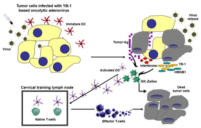 The entry of oncolytic viruses into tumour therapy is opening up groundbreaking changes in current and future treatment regimens. Despite this powerful mode of action against cancer, clinical studies have shown reduced replication of OVs in target cancer cells and subsequently limited efficacy as monotherapy. However, the good combinability of OVs with other interventions has the capacity to counteract this drawback without increasing toxicity. The development of effective combinatorial treatment strategies is therefore expected to be one of the keys to success, in establishing OVs in future clinical routine treatment regimens. In addition, it has been discovered that the overall anti-tumour activity of oncolytic viruses relies not only on their direct killing effects on local cancer cells, but also on the initiation of a systemic immune response. The capacity of oncolytic viruses to kill cancer cells and thus to activate anti-tumour immunity therefore makes a combination approach with existing immune therapies, e.g. immune checkpoint inhibitors, very exciting.