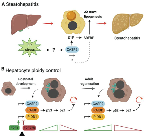 • E2F-Family Members Engage the PIDDosome to Limit Hepatocyte Ploidy in Liver Development and Regeneration. Sladky VC, Knapp K, Soratroi C, Heppke J, Eichin F, Rocamora-Reverte L, Szabo TG, Bongiovanni L, Westendorp B, Moreno E, van Liere EA, Bakker B, Spierings DCJ, Wardenaar R, Pereyra D, Starlinger P, Schultze S, Trauner M, Stojakovic T, Scharnagl H, Fava LL, Foijer F, de Bruin A, Villunger A., Dev Cell. 2020. Feb 10; 52(3): 335-349.e7.