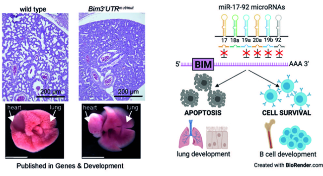 • The binding of miR-17~92 to a single target gene is essential for life – The regulation of BIM transcript levels by miR-17~92 microRNAs serves as a rheostat, which controls cell survival in the developing lung (Fig. 5).