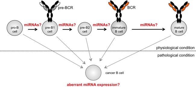 In our group, we are interested in deciphering the role of one type of such non-coding RNAs, microRNAs (miRNAs), in the regulation of complex transcriptional networks, using haematopoiesis and immune function as experimental model systems. MicroRNAs (miRNAs) are small, non-coding RNAs that mediate post-transcriptional silencing of a predicted 60% of protein-coding genes in mammals. Although discovered by Ambros and Ruvkun only in 1993, they have quickly emerged as central mediators of many, if not all, biological processes. In our work, we are trying to decipher how microRNAs influence lymphocyte development and function or, if aberrantly expressed, contribute to diseases such as cancer (Fig. 6). To elucidate the role of individual miRNAs under physiological as well as pathological conditions, we combine gain and loss-of-function approaches, both in in vitro systems and in gene-modified mouse models, with cell biological, biochemical and molecular approaches.