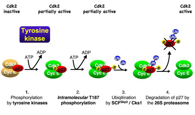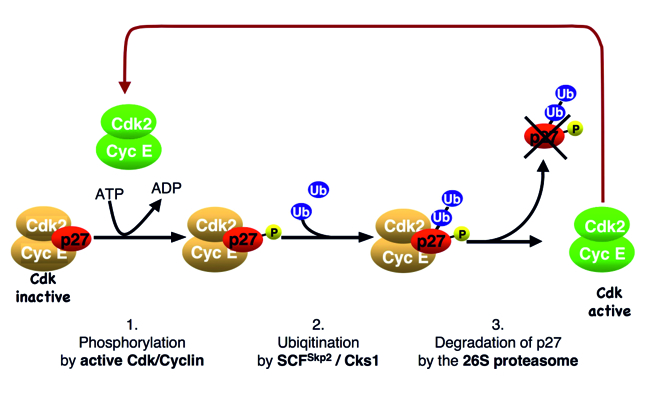 p27 regulates cell cycle progression over the restriction point. Abundant p27 binds and inactivates CDKs and can prevent cell proliferation. The CDK inhibitor protein becomes unstable upon cyclin/CDK2 activation, as cells traverse the restriction point and progress towards the S-phase. A positive feedback loop couples p27 ubiquitin-dependent degradation to CDK activation (Fig. 2). The molecular mechanism that can initiate this feedback loop in the presence of abundant CDK inhibitors and thus inactive CDKs has long remained an enigma.