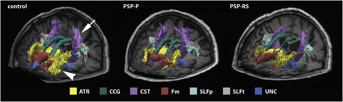Fig. 1: Diagnostic potential of automated tractography in progressive supranuclear palsy (PSP) variants: Visualisation of white matter tracts as reconstructed by TRACULA and rendered on a 3D T1-weighted MRI of a healthy participant (left), a PSP-P (middle) and a PSP-RS (right) patient. Reprinted from the publication “Potrusil-T et al., Parkinsonism and Related Disorders 2020 Mar;72:65-71, doi: 10.1016/j.parkreldis.2020.02.007. (Fig. 1.) ”, with permission from Elsevier