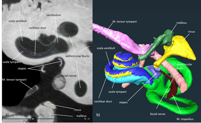 Based on micro-CTs of adult human temporal bones (middle ear, cochlea and vestibular organ) combined with high-resolution ultrastructural and structural data of tissue compartments, measurements of physiological parameters, gene and protein expression data, metabolic data and ion-channel distribution, we have developed a virtual 3D human temporal bone model (average of 10 Caucasian individuals) to optimise neurobionic device design and assess the effects of therapeutic hypothermia for inner ear protection during implant insertion (Fig. 2).