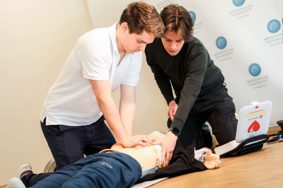 „Bei der Wiederbelebung gibt es zwischen Mann und Frau medizinisch keinen Unterschied – gedrückt wird in der Mitte des nackten Brustkorbs, fest und schnell“, erläutert Benjamin Treichl, Oberarzt an der Univ.-Klinik für Anästhesie und Intensivmedizin der Med Uni Innsbruck. „Auch bei Frauen soll niemand aus Unsicherheit oder falscher Rücksichtnahme zögern. Es gilt: Bewusstsein und Atmung kontrollieren, wenn diese fehlen den Notruf veranlassen oder selbst absetzen und dann ohne Zögern wiederbeleben – 30 Mal Herzmassage, 2 Mal Atemspende im Wechsel.“ Unsicherheit wurde bei der Innsbrucker Studie allerdings häufig beobachtet, wie Student Fabio Rützler berichtet: „Bei der weiblichen Reanimationspuppe starteten viele Teilnehmende die Reanimation ohne die vorschriftsmäßige vollständige Entkleidung, vor allem, wie sie mit dem BH umgehen sollen, war vielen unklar, es kam öfter zu Nachfragen. Den BH sollte man vollständig entfernen oder aufschneiden.“
